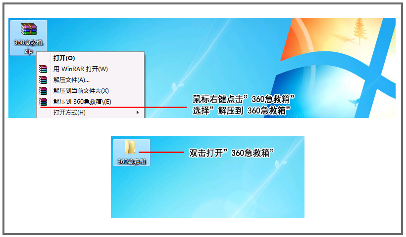 到桌面。鼠标右键点击“360急救箱”,选择“解压到360急救箱”。