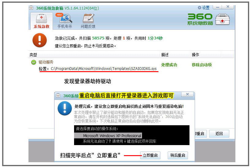 5.发现登录器劫持驱动,处理。选择立即重启。重启后直接打开登录器即可进入游戏。